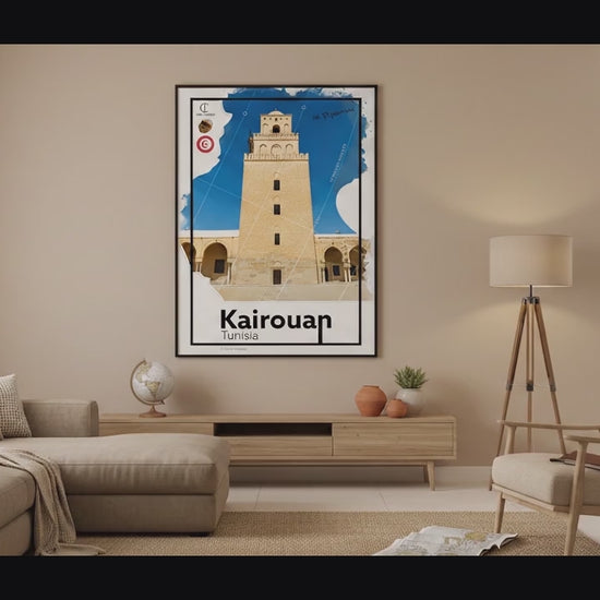 Breng de spirituele ziel van Tunesië in huis met deze Kairouan reisposter, waarop de indrukwekkende Grote Moskee centraal staat. Het ontwerp vangt de rust, historische kracht en architectonische schoonheid van een van de belangrijkste steden van Noord-Afrika.